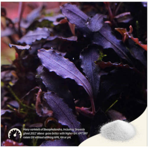 APT SKY resuelve el dilema clave de cómo aumentar la dureza del agua (específicamente como potenciador de GH) sin alterar los valores de NPK (que interfieren con las proporciones calibradas de los fertilizantes) y KH (donde los valores más altos no son favorecidos por la mayoría de las plantas acuáticas comerciales).