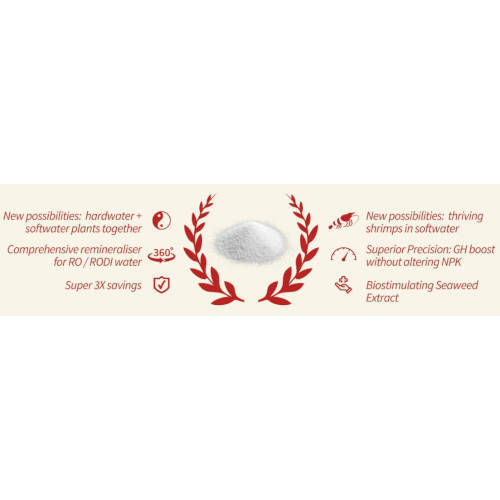 Repone todos los minerales vitales en el agua RO/RODI sin alterar negativamente el NPK, KH ni el pH.