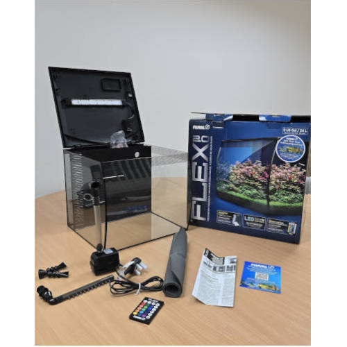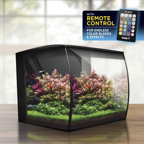 El NUEVO Fluval Flex de 34 litros es un kit de acuario que incluye una filtración de 3 etapas, iluminación LED con control remoto y un vidrio frontal cóncavo que le da un aspecto moderno y panorámico.